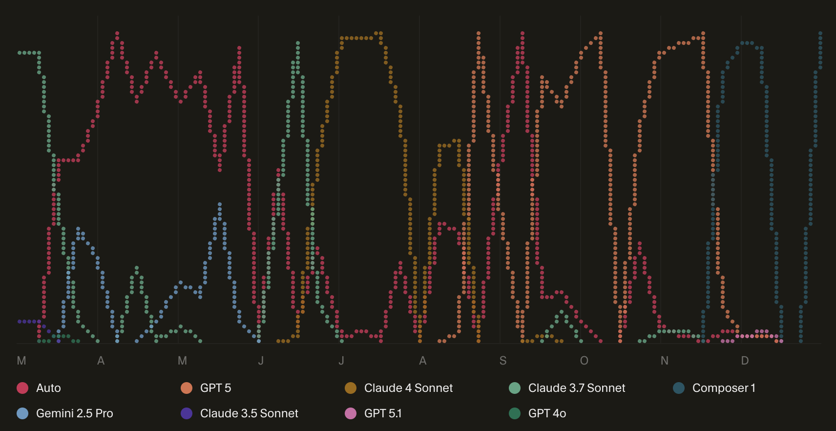 Over this same period, Cursor itself became significantly more powerful. They added Bugbot and Cloud Agents, and shipped their own powerful coding model, Composer-1. This followed significant improvements across model providers, and in fact my go-to model switched about six times over 2025: