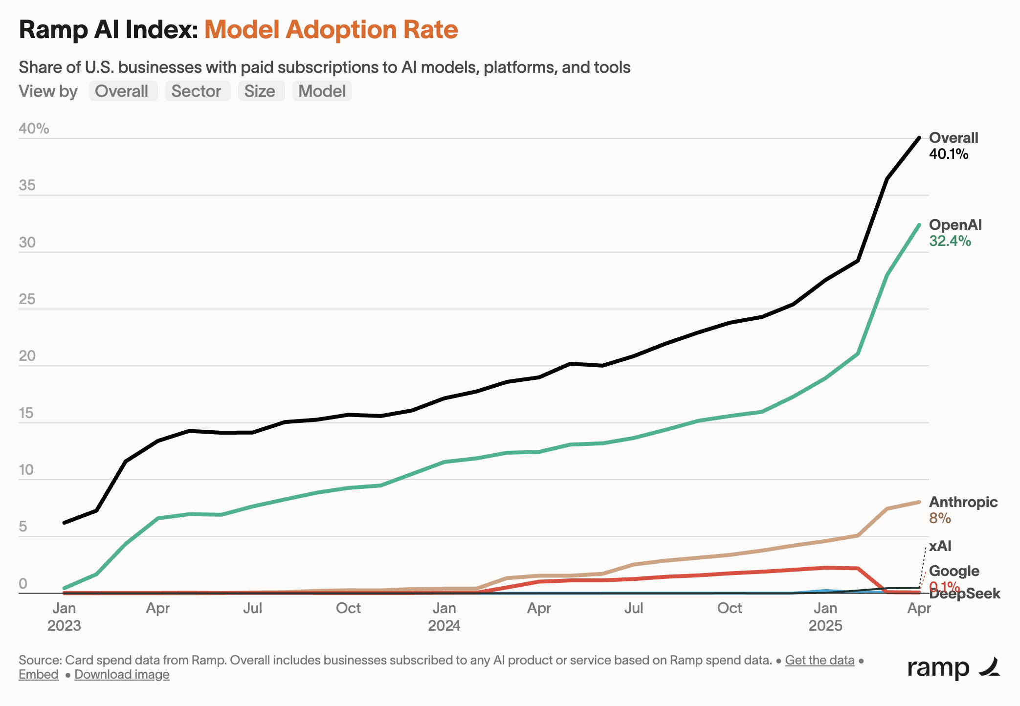 On (2), recent data from Ramp suggests OpenAI is making huge strides selling their products to businesses (B2B):